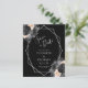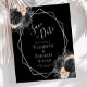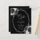 This elegant modern wedding save the date card features a silver geometric frame decorated with peach, black and silver floral bouquets on a black background. The customisable text combines silver grey whimsical handwriting, copperplate and italic fonts. The reverse side is solid black.