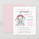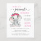 A cute budget-friendly baby girl shower invitation with "Our Sweet Little Peanut Is On Her Way" written in a mix of pink and soft grey typography and a pretty script with swashes, and a watercolor of a baby girl elephant with a pink floral wreath on her head. Easily personalise the names of the baby and the mother in pink typography and the shower details in simple modern grey typography
