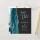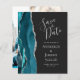 The left-hand edge of this elegant modern wedding save the date card features a teal blue watercolor agate border trimmed with faux silver glitter. The customisable text combines silver grey handwriting, copperplate and italic fonts on an off-black background. Easily replace the sample image on the back with your own vertical photo.