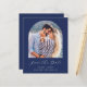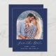 This simple, minimalist Save the Date card features a boho photo arch above the words "Save the Date" in elegant white handwriting script, followed by the couple's names, wedding date and city in sans serif font on a navy blue background. Add a more detailed message with additional information on the reverse.