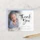 Budget Photo Boy Thank You Birth Annnouncement. A budget price SMALLER 4.5” x 5.6” alternative. Available in a SEMI GLOSS 110 lb CARD STOCK which is the default option (recommended for invitations, similar to the thickness of a postcard), OR a SATIN FINISH 80 lb THINNER PAPER STOCK (ideal for enclosures). Send the joyful news of your new baby son and say thank you at the same time with this minimalist photo design, with a beautiful set script for Thank You and the rest of the text on both sides is easy to personalise. Replace the sample photo with your own. A gradient overlay layer is on top of your photo so it fades out as it reaches the centre with the text partially overlaid on top. You can change the background colour on the back via customise further to another colour if better suits your image.
