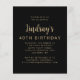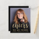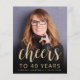 The front of this 40th birthday invitation features the guest of honour's photo with a gold-coloured text overlay. The word "cheers" appears in elegant gold-coloured calligraphy script, followed by "to 40 years" and the guest of honour's name and birthday in sans serif font. A dark screen helps make the text pop. Customise the reverse side with the name and party details on a black background. A great way to celebrate someone who's turning forty!