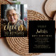 The front of this 80th birthday invitation features the guest of honour's photo with a gold-coloured text overlay. The word "cheers" appears in elegant gold-coloured calligraphy script, followed by "to 80 years" and the guest of honour's name and birthday in sans serif font. A dark screen helps make the text pop. Customise the reverse side with the name and party details on a black background. A great way to celebrate someone who's turning eighty! (NOTE: Envelopes are not included automatically with this budget invitation. To add envelopes to your order, please use the "Envelopes" drop-down menu.)