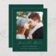 This simple, minimalist Save the Date card features a square photo above the words "Save the Date" in elegant gold-coloured handwriting script, followed by the couple's names, wedding date and city in sans serif font on an emerald green background. Add a more detailed message with additional information on the reverse, along with a QR code that sends guests to your wedding website.