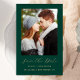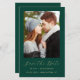 This simple, minimalist Save the Date card features a vertical photo above the words "Save the Date" in elegant gold-coloured handwriting script, followed by the couple's names, wedding date and city in sans serif font on an emerald green background. Add a more detailed message with additional information on the reverse.