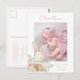 Sweet watercolor bunny rabbit in a basket accent your favourite photo for this adorable birth stats baby girl announcement. Soft colour flowers all around. Hand drawn bunny rabbit. Sweet customisable message on reverse of this cute baby girl birth announcement.