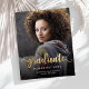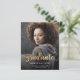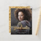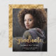 Modern graduation announcement featuring a custom vertical photo. The word "graduate" appears in gold faux foil script with curly decorative swashes at the beginning and end. Add the graduate's name, school, and year of graduation below in white sans serif font. Easily replace the sample image with your own graduate's photo. A black gradient screen helps ensure the text pops. The back features a gold faux foil polka dot pattern. Ideal for high school or college graduation.