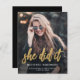 Modern graduation announcement featuring a custom vertical photo. The phrase "she did it" appears in gold faux foil script, with the graduate's name, school, and year of graduation below in white sans serif font. Easily replace the sample image with your own graduate's photo. A black gradient screen helps ensure the text pops. The back of the card is solid black. Ideal for high school or college graduation.