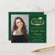 Formal budget-friendly green college graduation announcement featuring "Class of" in a gold illustration of laurel wreath incorporating a grad cap topper and diploma, a photo of the graduate and their name in an elegant gold script. Add their school, major, honours or future plans in classic gold serif typography. This budget semi-gloss paper is similar in weight to photo paper. A larger 5x7 traditional card stock version is also available (message us for the link).