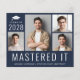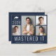 Budget-friendly dark blue masters degree graduation announcement and party invitation featuring a 4 photo collage, "Mastered It" written in large white letters and his or her class year, name and college or university in simple white typography. On the reverse side, add the graduation party details.