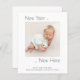Budget Photo New Year New Here Birth Announcement . A smaller 4.5 x 5.6” on a 110gsm semi-gloss (similar in thickness to a postcard). Your new baby has arrived for the new year! You'll be eager to announce the wonderful news to your loved ones. You can wish them a Happy New Year at the same time with this modern design New Year, New Here which is fully customisable along with your favourite photo of your new baby girl or boy. Your favourite photo is in a square format in the centre, with lots of white space surrounding it for a contemporary touch. Easily personalise the text on the front and back with your own, including all the details of your new arrival on the back, and simply replace the sample photo in the template placeholder with your own. You can also change the background and text colours on either side if you wish via customise further.