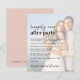 Modern blush pink budget-friendly wedding announcement and reception invitation featuring your photo overlayed with "Happily Ever After Party" in a blend of a contemporary script and bold lettering. Personalise your invitation and add your names in a signature-like script. On the back, your names and wedding and reception dates are joined together by a heart (if your wedding and reception dates are different, keep your first names on the top line and your two dates separated by the heart on a second line).