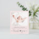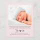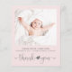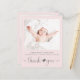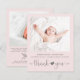 A budget-friendly simple and sweet baby girl thank you birth announcement with modern soft grey typography against a pastel pink background. The front features your baby girl's photo, name, arrival date and birth stats, and "thank you" written in a trendy script with a heart joining the two words. On the reverse side add an additional photo, and personalize a thank you message and parent and sibling names under a coordinating cute arrow with a heart in the middle.