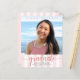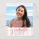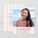 Be proud, rejoice and announce to the world that your favourite grad has reached their milestone with this stunning, simple, modern, personalised budget announcement invite. Sparkly, elegant, faux rose gold glitter calligraphy script, grey sans serif typography and a photo of your choice overlay a light pink and white striped background. Personalise the custom text with your graduate’s name, school name, class year, and graduation date. On the back, add your personal note, next school they’re attending, party information, etc. Guaranteed to add stylish fun to their special occasion!