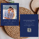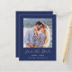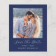 This simple, minimalist Save the Date card features a square photo above the words "Save the Date" in elegant white handwriting script, followed by the couple's names, wedding date and city in sans serif font on a navy blue background. Add a more detailed message with additional information on the reverse, along with a QR code to help your guests visit your wedding website.