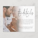 Budget Photo QR Code Wedding Details Enclosure. A budget price SMALLER 4.5” x 5.6” alternative. Available in a SEMI-GLOSS 110 lb CARD STOCK which is the default option (thicker for invitations), OR a SATIN FINISH 80 lb THINNER PAPER STOCK (ideal for enclosures). Add your QR code to your wedding website on the back makes this a convenient option for your guests to see all the details. You can create QR codes for free online. Simply search “QR code creator” and lots of options come up to create for free. A minimalist fun design to let everyone know your happy news. Simply replace the sample photo with your own favourite. A gradient overlay layer is on top of your photo so it fades out as it reaches the centre with the text partially overlaid on top. The Details is in a modern set script and easily personalise the rest of the text.