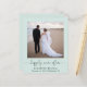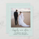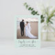 Budget-friendly light mint green elopement or private wedding announcement and post-wedding reception invitation with your photo, "happily ever after" in a chic calligraphy script with swashes and your first names, wedding date and location. On the reverse side, customise your announcement and reception or party invitation, input your wedding website URL address to create a QR code for guests to scan to see your wedding photos, all the details and to RSVP online and sign your married names in a signature-like script.