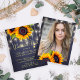 Rustic country style PHOTO BUDGET affordable graduation party stylish invitation template on dark midnight navy blue chalkboard background featuring big yellow gold sunflowers bouquets and strings of twinkle lights. ++++++++++++++++ The invitation is suitable for outdoor garden / backyard rustic country graduation evening parties. +++++++++++++++++++++++++++++ PLEASE READ THIS BEFORE PURCHASING! This is a budget affordable wedding card printed on a paper sheet (each sheet has one card). ++++ For the best rapport price quality, our advice is to choose the Semi-Gloss paper type (it is thick enough to be used for stationery) ++++ If you need envelopes, choose the ENVELOPE OPTION. +++ Double-check all the information and spelling of your text because you will receive exactly what you see - no one else will check anything before printing. ++++ This card is designed for size 4.5" x 5.6". In the case you choose another size of the card and text goes outside page, everything needs to be fixed before adding the product to cart. Please ask Live Design Service for help.