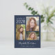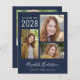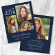 Budget-friendly dark blue graduation announcement and party invitation with a 3 picture photo collage, "Graduate" in a stylish white script, and the grad's name, class year and school or university in modern white typography. On the reverse, add an additional picture and your graduation party details.