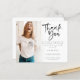 A value for money BUDGET alternative on a smaller size 4.5 x 5.6” semi-gloss 110lbs weight, which is of similar thickness to a postcard (however is not suitable to use as a postcard.). PLEASE NOTE there is ONE per sheet. Budget Photo Script Graduation Thank You. Say thanks after your grad party with this minimalist photo design, with a beautiful set script for Thank You and the rest of the text is easy to personalise. Replace the sample photo with your own. A gradient overlay layer is on top of your photo so it fades out as it reaches the centre with the text partially overlaid on top.