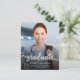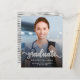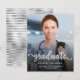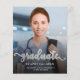 Modern graduation announcement featuring a custom vertical photo. The word "graduate" appears in silver faux foil script with curly decorative swashes at the beginning and end. Add the graduate's name, school, and year of graduation below in white sans serif font. Easily replace the sample image with your own graduate's photo. A black gradient screen helps ensure the text pops. The back features a silver faux foil horizontal stripe pattern. Ideal for high school or college graduation. NOTE: Envelopes are not automatically included with these budget invitations, so please remember to choose the "blank white envelopes" option!