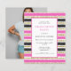 A budget price SMALLER 4.5” x 5.6” alternative. Available in a SEMI-GLOSS 110 lb CARD STOCK which is the default option (thicker for invitations), OR a SATIN FINISH 80 lb THINNER PAPER STOCK (ideal for enclosures). Envelopes are an optional extra and are slightly larger than the card size.. Glam pink and black stripes for this girly design. Easily personalise the text and replace the photo on the back with your own.