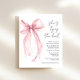 Chic budget-friendly bridal shower invitation featuring a watercolor of a light pink coquette bow, "She's tying the knot" in a modern calligraphy script, and her name and the event details in simple lettering. This budget semi-gloss paper is similar in weight to photo paper. A larger 5x7 traditional card stock version is also available (message us for the link).