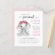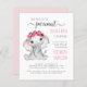 A budget-friendly drive by baby girl shower invitation. "Our Sweet Little Peanut Is On Her Way" is written in pink and soft grey typography and a pretty script with swashes. Personalise the names of the baby girl and the mother-to-be in pink typography next to a cute watercolor of a baby girl elephant with a floral wreath on her head, and add the drive by shower details in simple modern grey typography.