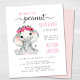 A cute budget-friendly girl baby sprinkle invitation with "Our Sweet Little Peanut Is On Her Way" written in a mix of pink and soft grey typography and a pretty script with swashes, and a watercolor of a baby girl elephant with a floral wreath on her head. Personalise the names of the baby gIrl and the mother in pink typography and the sprinkle details in simple modern grey typography.