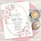 Elegant and feminine First Communion invitation features beautiful pink roses and white magnolia flowers decorating an oval gold frame. All of the text is editable so you can also use it for any type of religious ceremony, Baptism, Christening, Dedication or Confirmation.