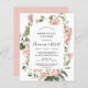 Elegant dusty pink roses are nestled in dark green foliage. They form a floral frame around your rehearsal dinner details.