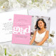 Make sure all your friends and relatives will be able to celebrate your graduate’s milestone graduation! Send out this stunning, simple, modern, personalised photo “Save the Date” budget announcement for an event to remember. Bold, graphic, white and soft grey typography overlay a soft pink background. On the right hand side, add a photo of your choice. Personalise the custom text with your graduate’s name, class year and date. Your custom message and a pink graduation cap icon adorn the back. Matching invites, thank you cards, cap toppers, napkins, plates and other graduation goodies are also available in this trendy and stylish collection. Guaranteed to add stylish fun to their special occasion!