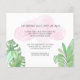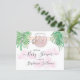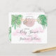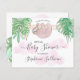 This pretty baby shower invitation features a sweet baby sloth hanging from a branch, framed with green watercolor jungle leaves and pink clouds.