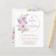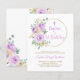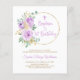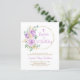 Purple flowers baby’s first birthday invitation featuring green eucalyptus leaves & purple watercolor roses and golden wreath