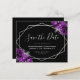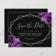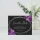 This elegant budget wedding save-the-date card features a silver geometric frame decorated with purple and silver flowers on a black background. The customisable text combines silver grey whimsical handwriting, copperplate and italic fonts.