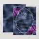 This elegant modern wedding menu features a silver geometric frame decorated with plum purple and silver floral bouquets on a navy blue faux foil background. The customisable text combines silver grey whimsical handwriting, copperplate and italic fonts.