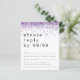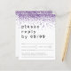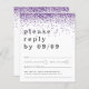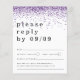 Budget Purple Glitter Confetti Wedding RSVP.A budget price SMALLER 4.5” x 5.6” alternative. Available in a SEMI GLOSS 110 lb CARD STOCK which is the default option (recommended for invitations), OR a SATIN FINISH 80 lb THINNER PAPER STOCK (ideal for enclosures). Envelopes are an optional extra and are slightly larger than the card size. The header is large below in stylish lowercase with the details at the bottom with a purple faux glitter confetti border at the top on each side. Easily personalise the text to your own details.