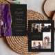 The left-hand edge of this elegant modern wedding invitation features a purple watercolor agate border trimmed with faux gold glitter. The customisable text combines gold-coloured handwriting, copperplate and italic fonts on an off-black background. The reverse side provides spaces for 4 photos (1 square, 2 horizontal, 1 long vertical) and room for your wedding website URL or other information. NOTE: Envelopes are not automatically included with these budget invitations, so please remember to choose the "white envelopes" option!