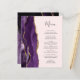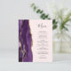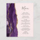 The left-hand edge of this elegant modern wedding menu features a purple watercolor agate border trimmed with faux gold glitter. The customisable text combines charcoal grey handwriting script and copperplate fonts on a blush pink background. The reverse side features a matching purple and gold agate design.