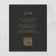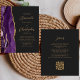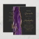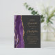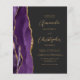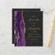The left-hand edge of this elegant modern wedding invitation features a purple watercolor agate border trimmed with faux gold glitter. The customisable text combines gold-coloured script and sans serif fonts on a slate black background. The reverse side provides space for wedding details on a solid slate black background, along with a QR code guests can scan to visit your website and RSVP, which saves the cost of printing and mailing separate RSVP cards.