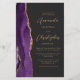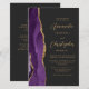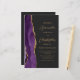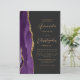The left-hand edge of this elegant modern wedding invitation features a purple watercolor agate border trimmed with faux gold glitter. The customisable text combines gold-coloured script and sans serif fonts on a slate black background. The reverse side provides space for wedding details on a solid slate black background, along with a QR code guests can scan to visit your website and RSVP, which saves the cost of printing and mailing separate RSVP cards.