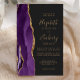 The left-hand edge of this elegant modern wedding invitation features a purple watercolor agate border trimmed with faux gold glitter. The customisable text combines gold coloured handwriting, copperplate and italic fonts on an off-black background. The reverse side features a matching purple and gold agate design.