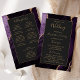 This elegant, modern wedding program features a purple agate background trimmed with gold faux glitter. The text appears in elegant gold colored handwriting and copperplate fonts on an off-black rectangle.