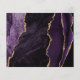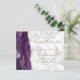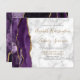 The left-hand edge of this elegant modern wedding invitation features a purple watercolor agate border trimmed with faux gold glitter. The customisable text combines black and gold-coloured handwriting, copperplate and italic fonts on a grey and white marble background. The reverse side features a matching purple and gold agate design.