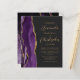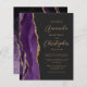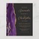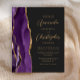 The left-hand edge of this elegant modern wedding invitation features a purple watercolor agate border trimmed with faux gold glitter. The customisable text combines gold-coloured script and sans serif fonts on a slate black background. The reverse side features a matching purple and gold agate design.