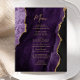This elegant modern wedding menu features a purple watercolor agate border trimmed with faux gold glitter. The customisable text combines gold-coloured handwriting script and copperplate fonts. The reverse side features a matching purple and gold agate design.
