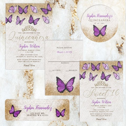 Budget Elegant Purple Gold Tiara Butterflies Sweet 16 Invitation