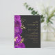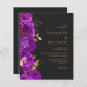 This romantic, moody, dark floral wedding invitation features a border of purple flowers set off with gold faux foil foliage. The names of the couple appear in classic gold-coloured serif font, with the remaining text in italics, on an off-black background.