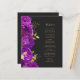 This elegant modern wedding menu features a border of purple flowers and gold faux foil leaves. Customise the gold-coloured italic text on a dark slate black background. The back of the menu is solid slate black,