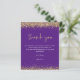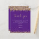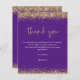 Budget Purple Gold Glitter 2024 Graduation Thank You. A budget price smaller (4.5 x 5.6”) semi-gloss which is a 110 gsm card stock, similar in thickness to a postcard. NOTE there is ONE per sheet.. Elegant gold faux glitter confetti borders are at the top and bottom and also on the back. Graduation is set in a modern handwriting style. Easily personalise the rest of the text to your own.